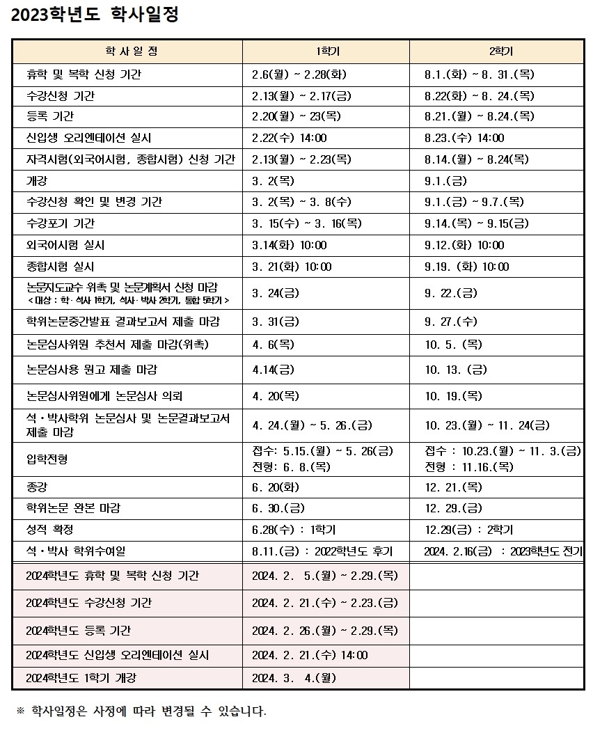 ※ 학사일정은 사정에 따라 변경될 수 있습니다.
